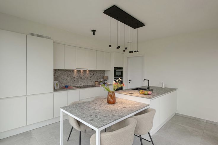 De fantastische leefkeuken met Siemens toestellen beschikt tevens over een ontbijthoek. Naast deze leefkeuken is een enorme berging voorzien.