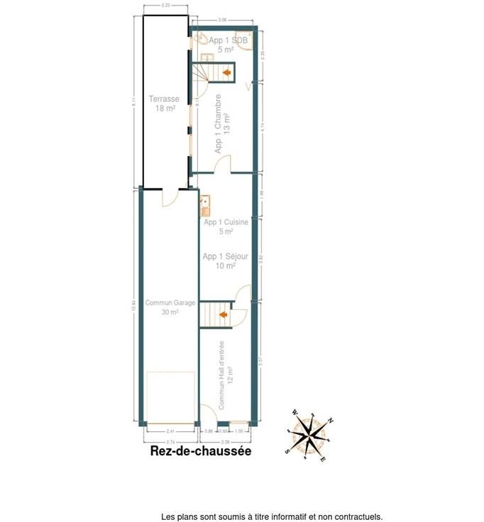 Au rez de chaussée, le hall commun mène à l'appartement du rez : séjour, cuisine semi-équipée, 1 chambre lumineuse et salle de douches. Cet appartement profite, en exclusivité, de l'extérieur (terrasse et jardin orientés plein sud).