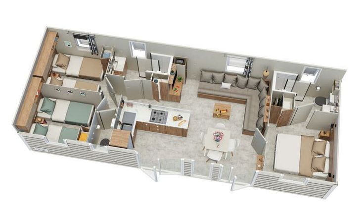 De chalet beschikt over 3 slaapkamers, 2 badkamers, 2 aparte toiletten, een mooie open keuken en een volledig ingerichte woonkamer.
