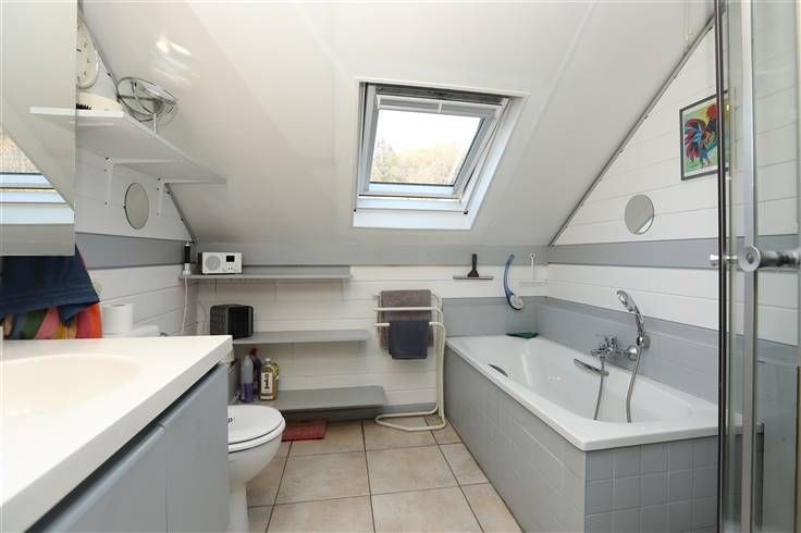 Onder het dak 4 slaapkamers 11-13-13-14 m², nachthal/kleine salon/bibliotheek 14 m² en badkamer 6 m² met ligbad, stortbad, wastafel en wc.
