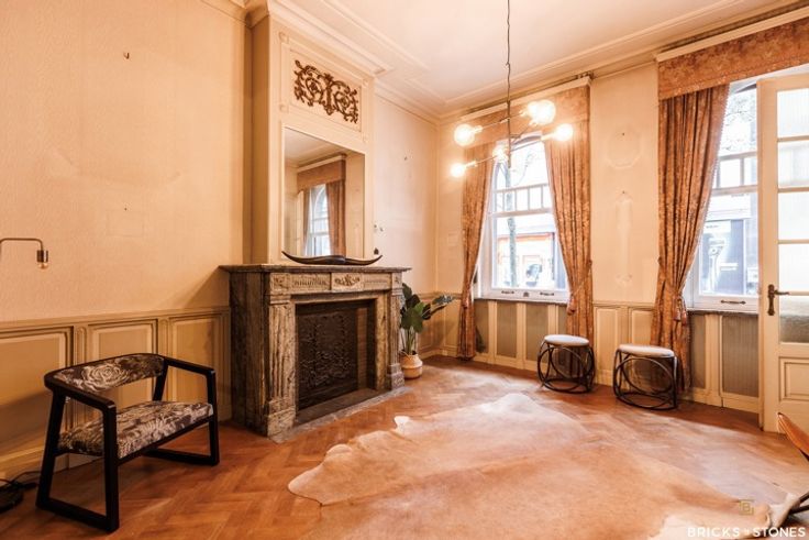 Majestueuze inkomhal met marmer. Vooraan riante ruimte voorzien van visgraatparket, authentieke elementen, originele marmeren schouw, torenhoge plafonds en veel daglicht. De ideale plek om uw klanten te ontvangen en in te richten als showroom of winkelruimte.