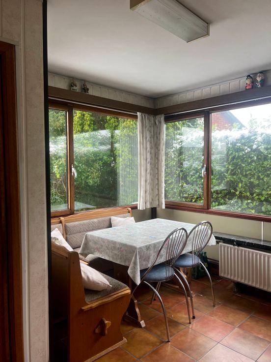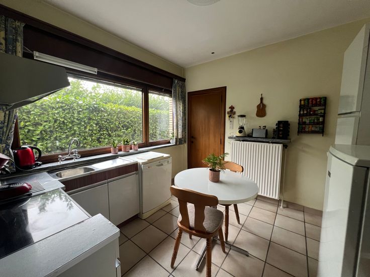 Er is een ruime garage met verschillende bergingen. Een ruime inkomhall met toegang tot het bureau, de leefruimte, keuken. Er zijn mogelijkheden om de keuken heel wat ruimer te maken en het zicht op de tuin te behouden. De woning beschikt over 3 slaapkamers, ideaal voor een gezin en de slaapkamers zijn ruim genoeg om te personaliseren en naar uw smaak te moderniseren.