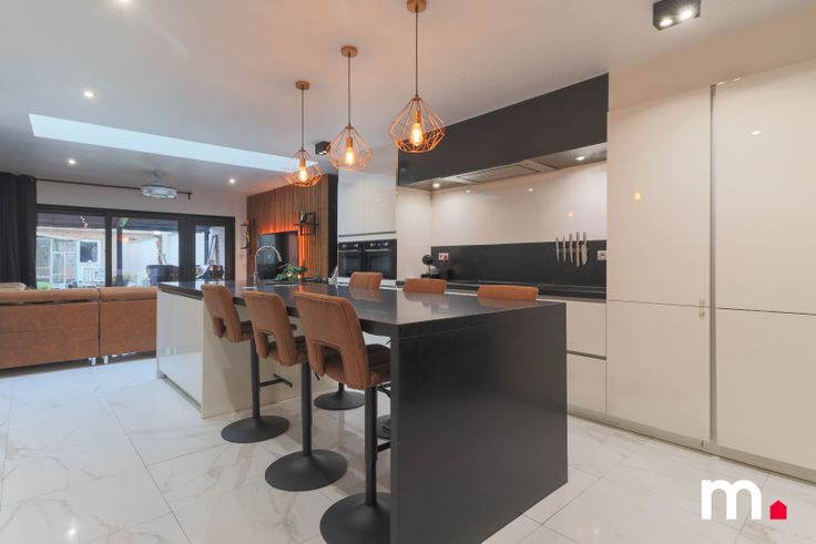 Aansluitend is er de grote lichtrijke leefruimte met volledig ingerichte keuken (2 combi ovens, grote ijskast met daarnaast diepvries, kookplaat, vaatwasmachine,..). Ook is er een praktische berging.