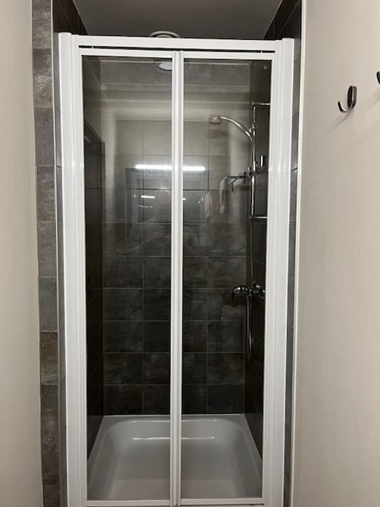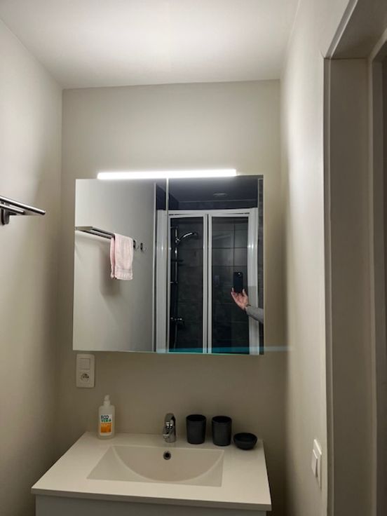 - badkamer met douche, inbouwwastafel en spiegelkast