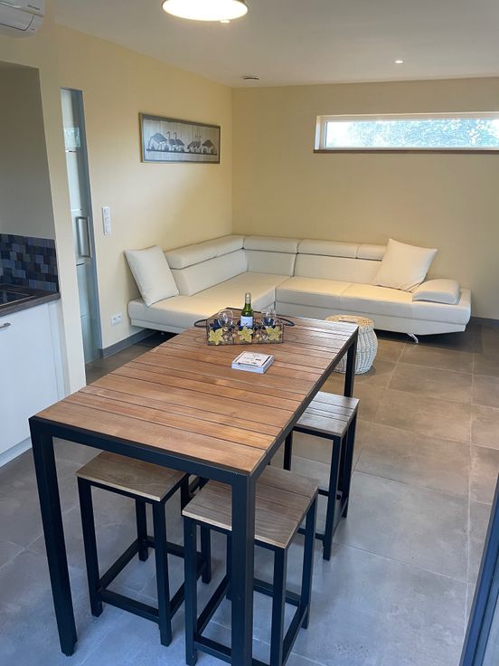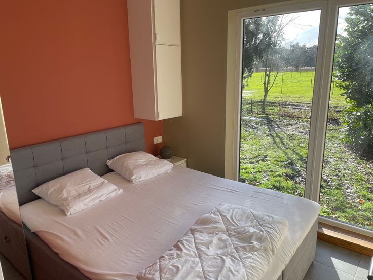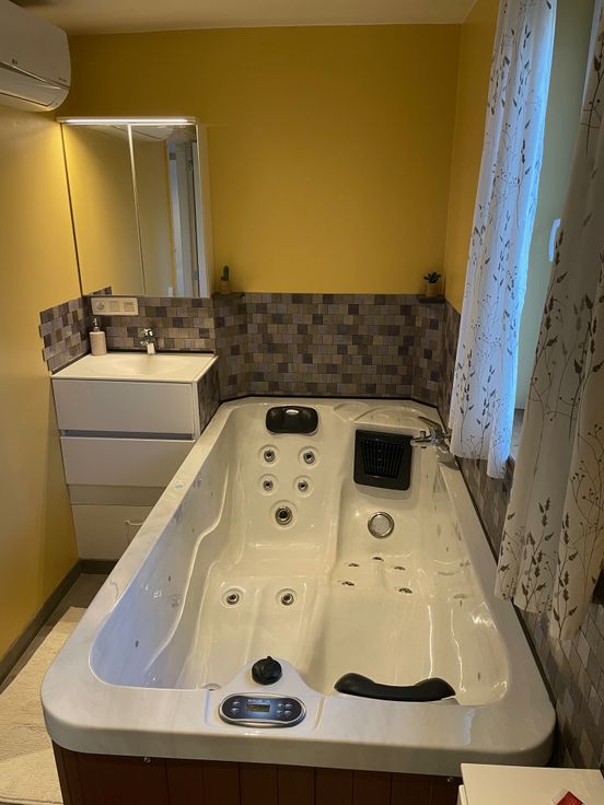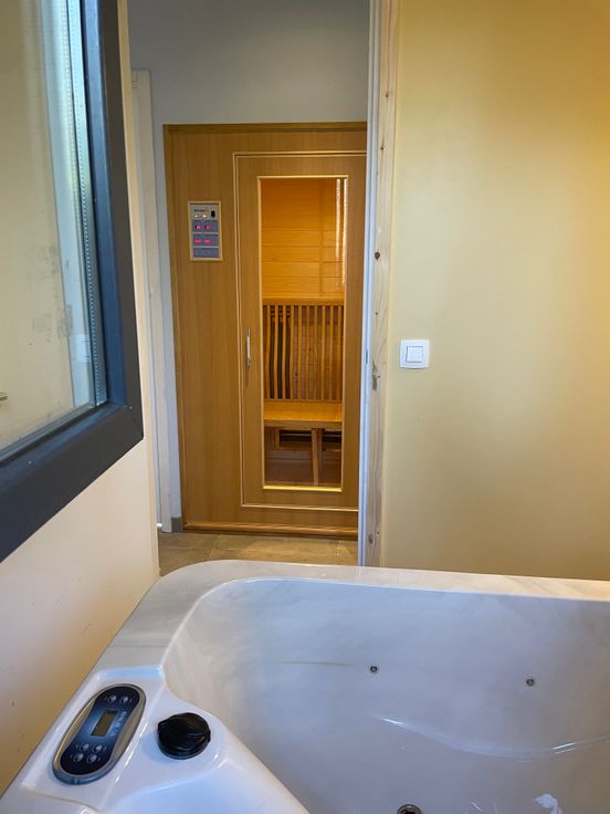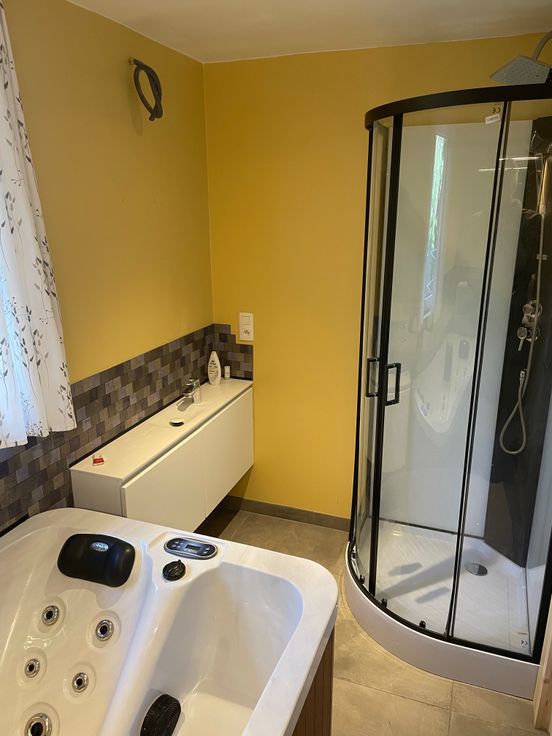 Deze vakantiewoning bevindt zich helemaal aan het einde van een dreef waardoor men ten volle kan genieten van de natuur met maximale privacy. Eens binnengekomen heeft men de technische ruimte en een klein apart toilet aan de linkerzijde. Vervolgens zijn er 2 slaapkamers met respectievelijk ruimte voor een queen-size bed en een stapelbed. De badkamer is uitgerust met een prachtige jacuzzi voor 2 personen die uitstekend past bij de infraroodcabine. Verder vindt men een aparte douche en 2 badkamermeubels. Aan het einde van de gang komt men in de leefruimte met open keuken en een uitgestrekt zicht op velden alsook op het bos.