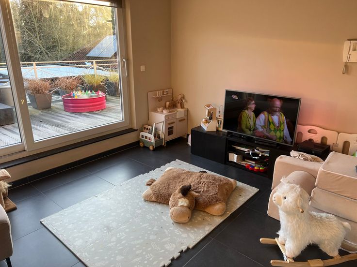 Op de 1e verdieping bevindt zich een ruime leefruimte met open keuken. Deze leefruimte staat in verbinding met een dakterras van 35m² dat zuidelijk georiënteerd is en uitzicht geeft op het achterliggende bos. Er is een zonneluifel.