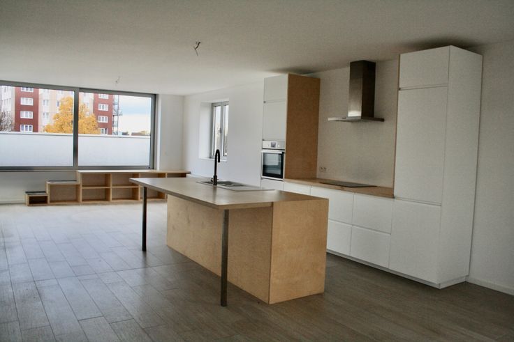 De open keuken beschikt over een eiland en biedt zicht op de eetkamer, living en terras.