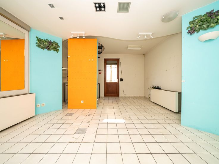 De glazen deur verwelkomt je in de kantoor/winkelruimte van 32m². De verschillende muurtjes die je ziet zijn gyproc wanden die makkelijk te verwijderen zijn als jij er één grote, open ruimte van wil maken.