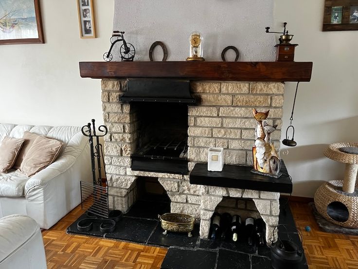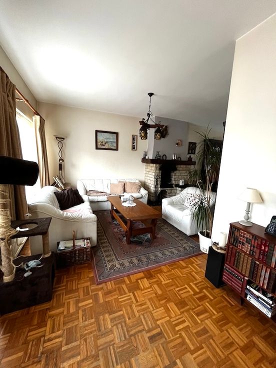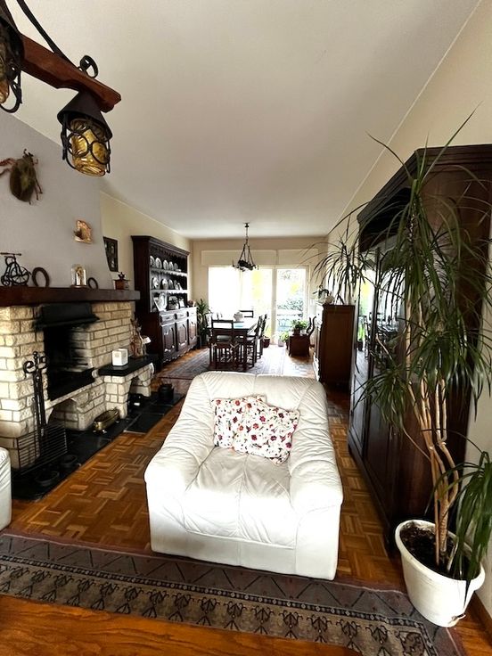 Premier étage : Séjour en L avec feu ouvert et parquet d’époque (35 m2), cuisine, terrasse, jardin