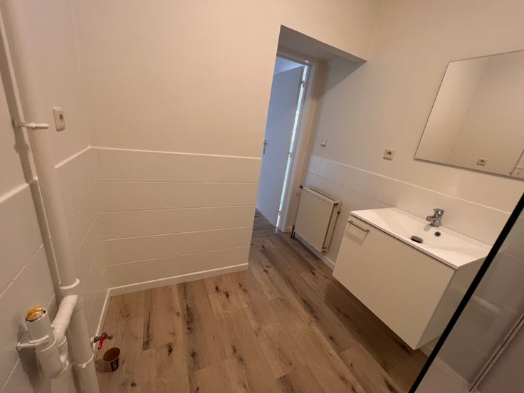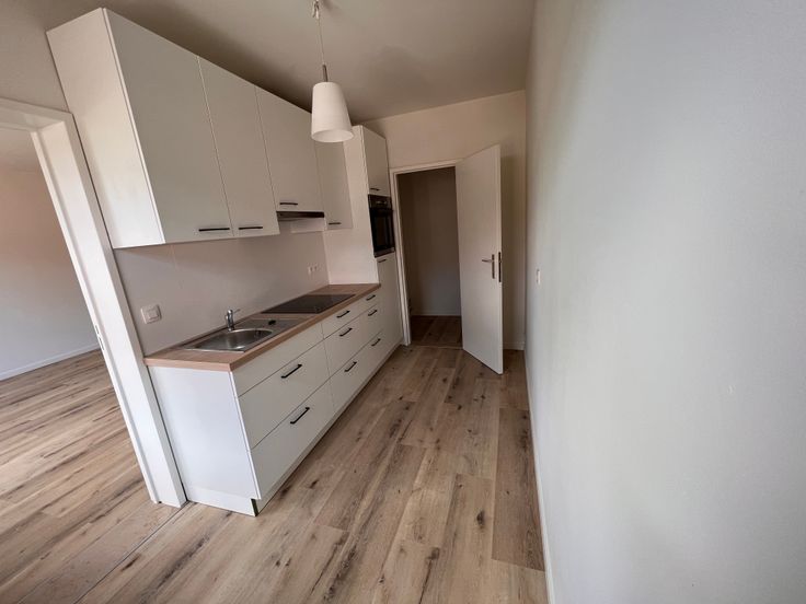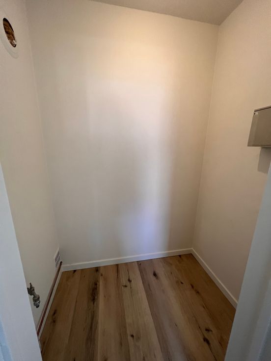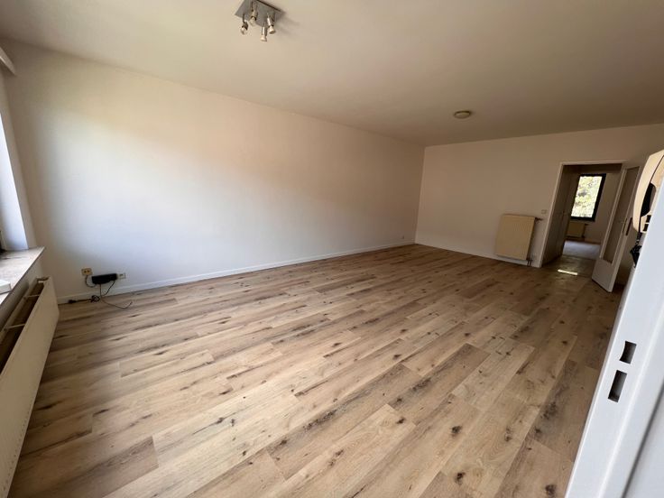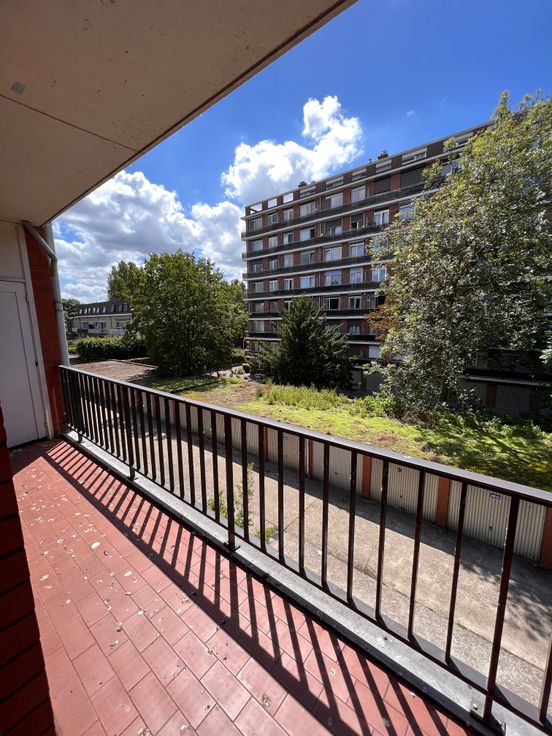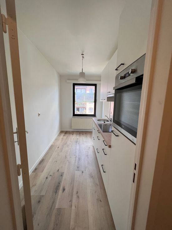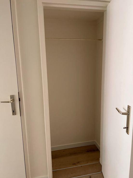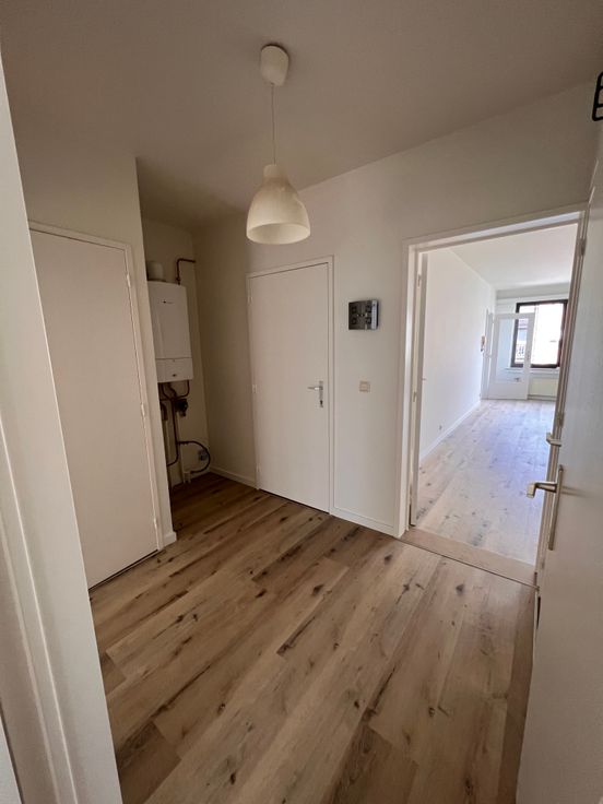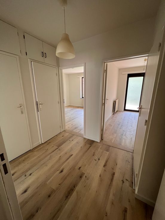 We betreden het appartement en bevinden ons in de gang die toegang geeft tot een aparte WC, een kleine slaapkamer, een grote slaapkamer, een vestiairekast, de badkamer en de leefruimte. Via de leefruimte betreden we de recent vernieuwde keuken waaraan nog een kleine berging grenst.
