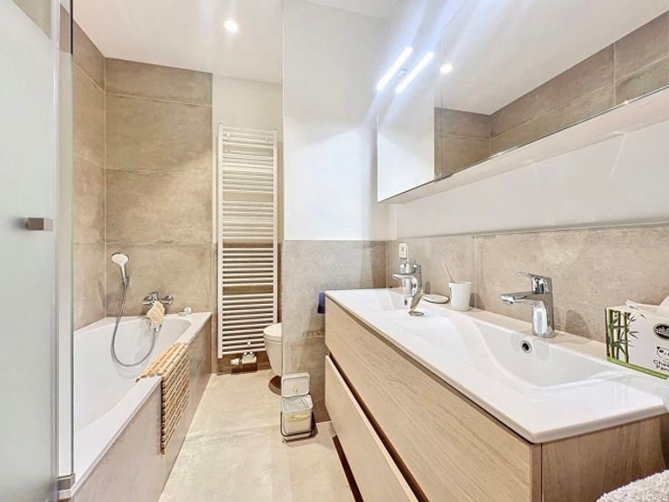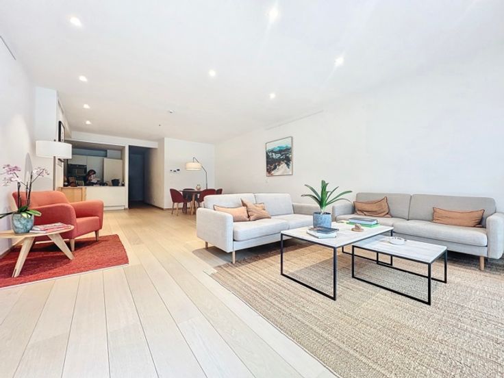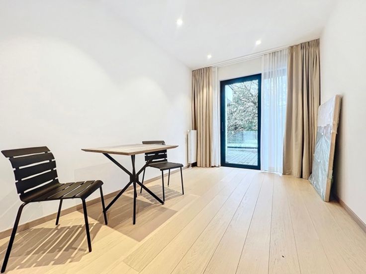 Op een steenworp afstand van het Brugmannplein en het Kasteleinplein, in een residentiële buurt, trendy en erg populair, dichtbij winkels, restaurants en openbaar vervoer, SCHITTEREND 2 slaapkamer appartement van ± 110m² + 55m2 terras volledig gerenoveerd met zeer hoge standaard afwerking. Het appartement is als volgt samengesteld: woonkamer en eetkamer (50m2), terras (55m2), volledig ingerichte keuken, 1 slaapkamer (19m2) met kleerkasten en doucheruimte en wc en 1 slaapkamer (19m2) met dressing en badkamer + douche + wc, elk met toegang naar het terras. Comfort: gepantserde deur, videofoons, dubbelstroomsysteem, individuele condensatieketels op gas. Mogelijkheid om een parkeerplaats te huren (175 € / maand), gemeenschappelijke tuin aan de achterzijde van het gebouw. TE HEBBEN !!