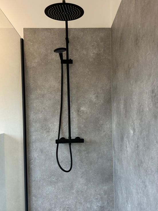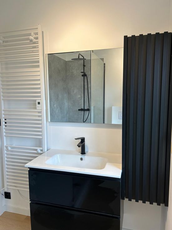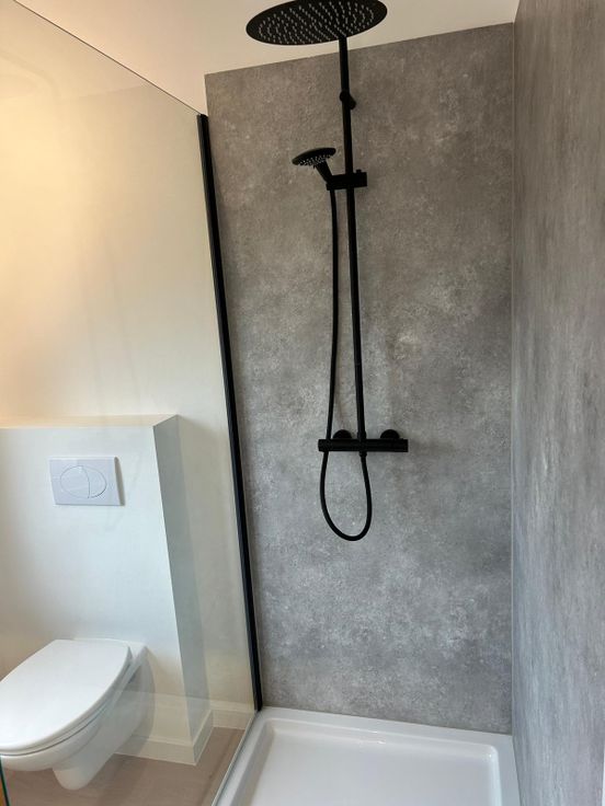 Nieuwe badkamer: strak, modern en van alle gemakken voorzien met grote inloopdouche, hangtoilet, wastafel en kolomkast.