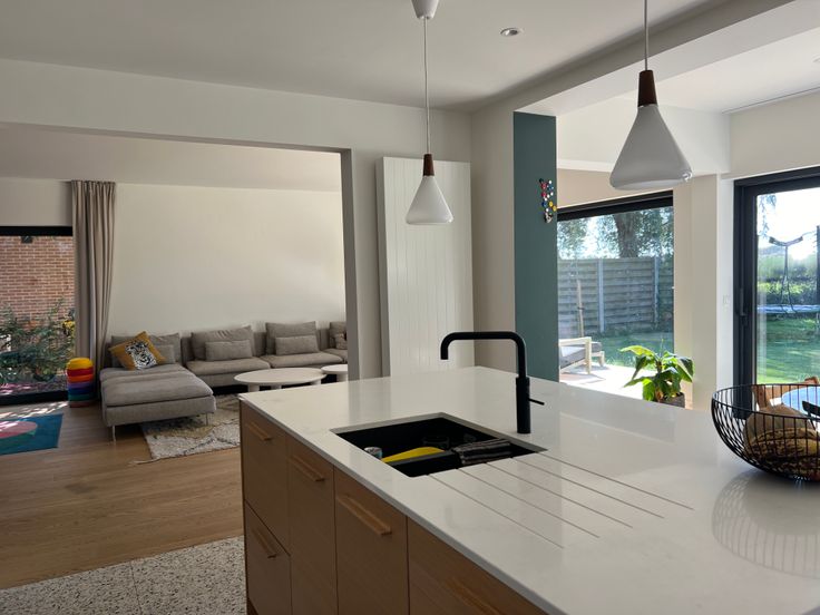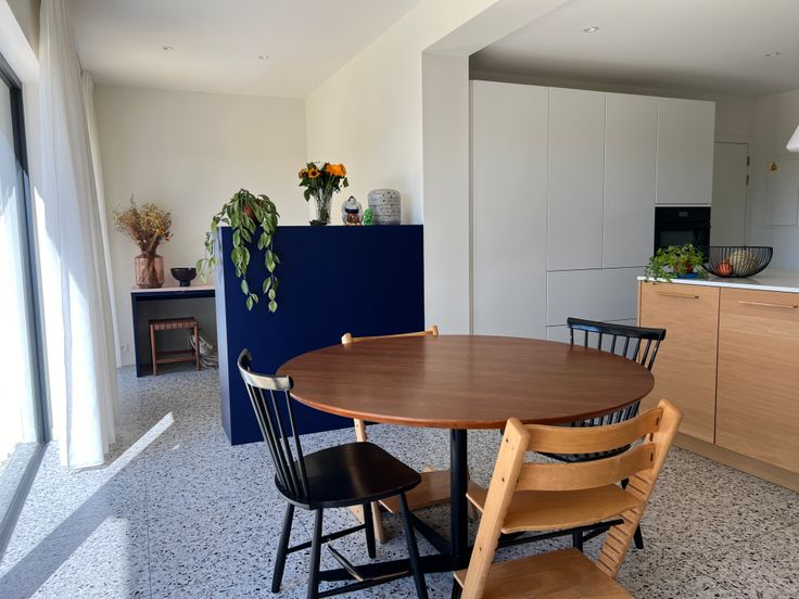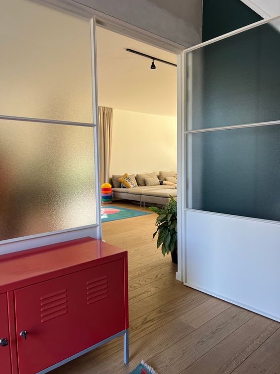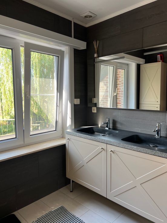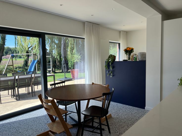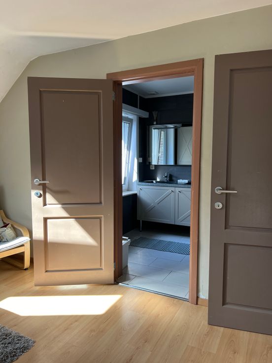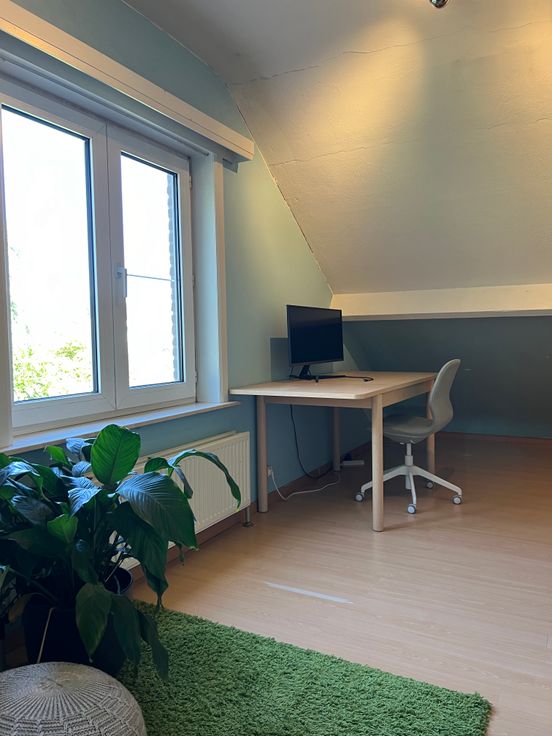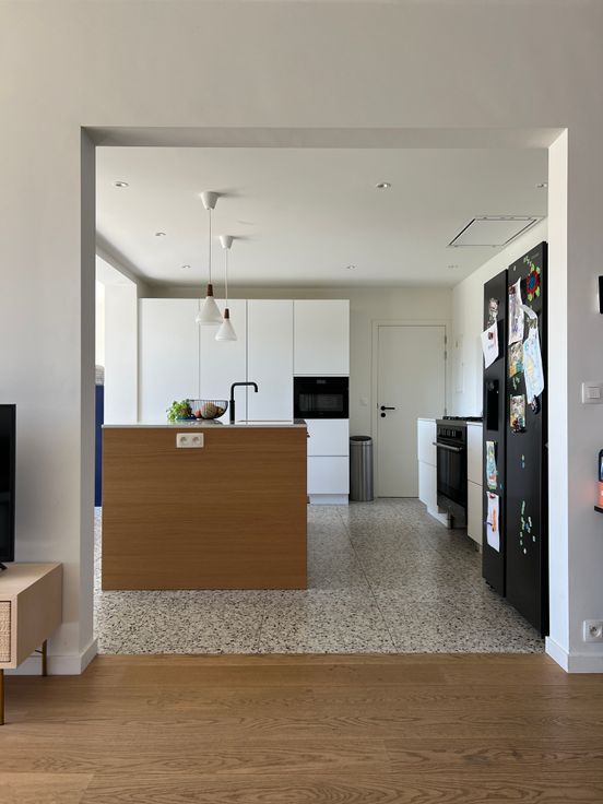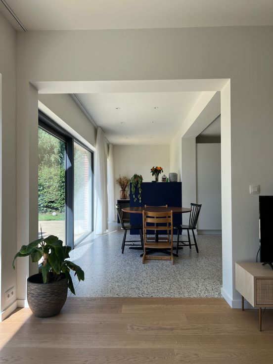 Gelijkvloers: Volledig gerenoveerd in 2021. Hier vindt u een ruime, lichtrijke leefruimte (woon en eetkamer) met grote raampartijen, een gezellige ontbijthoek, en een volledig ingerichte keuken. Aanpalend vindt u een ingemaakte bureau, perfect voor thuiswerk of als studeerruimte.
