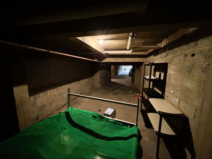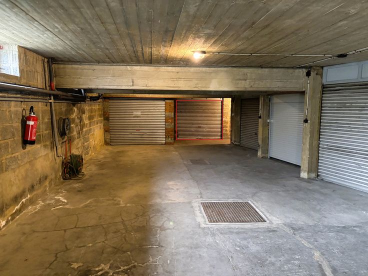 La garage se situe au sous-sol d'un immeuble avec un accès par une porte sectionnelle.