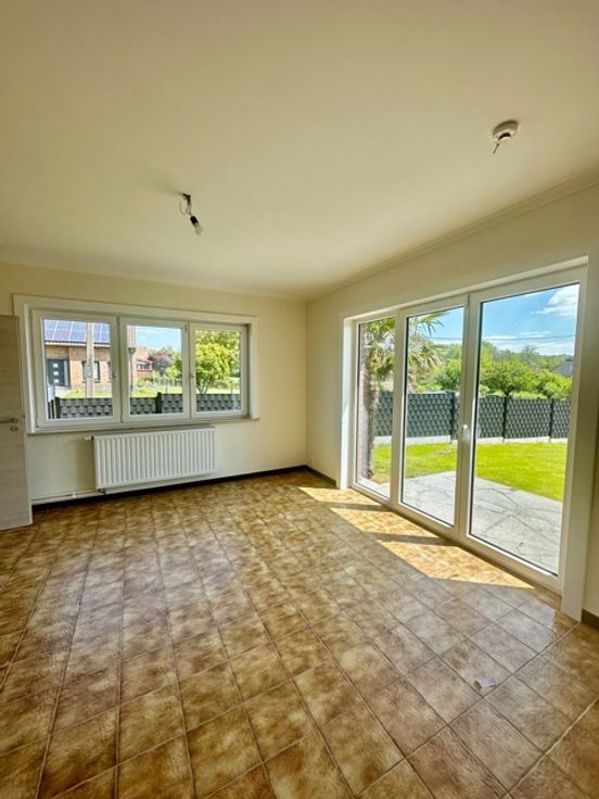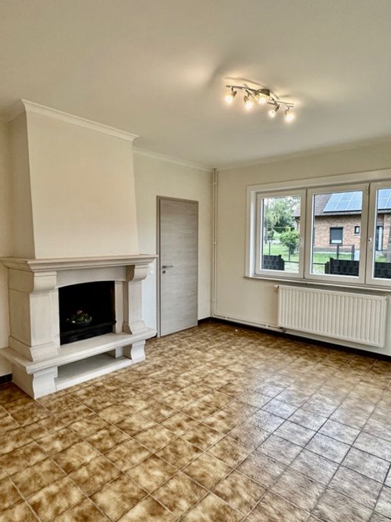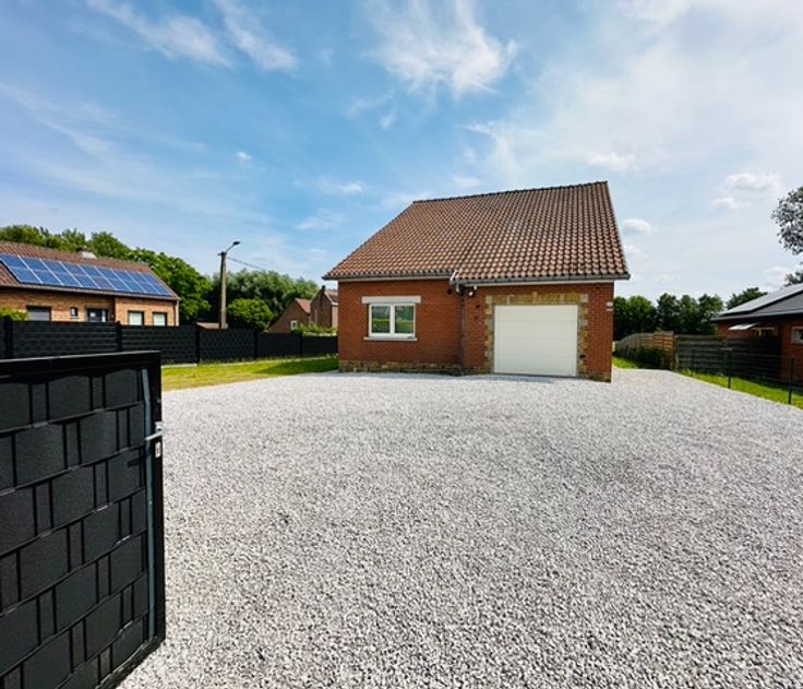 Hall d'entrée, wc, living avec feu ouvert en pierre de France, cuisine semi équipée accessible en voiture par voie latérale, chambre ou bureau, salle de bain avec bain et double lavabo, garage avec porte motorisée donnant accès direct de plain pied à la maison