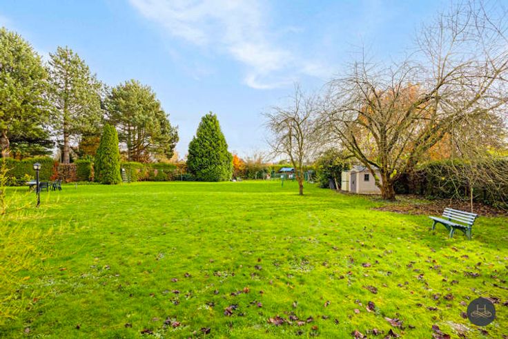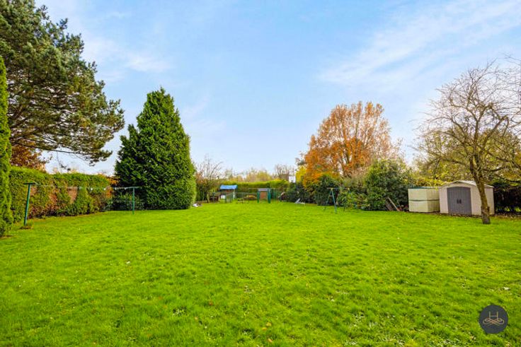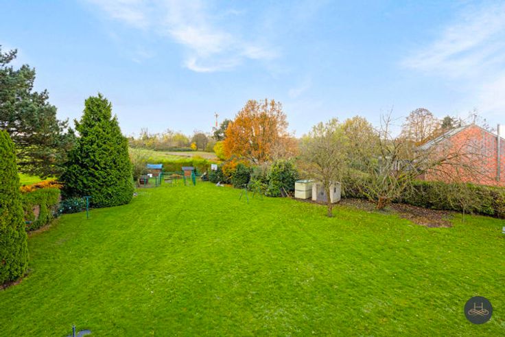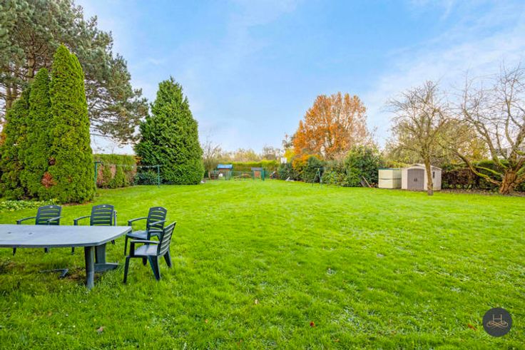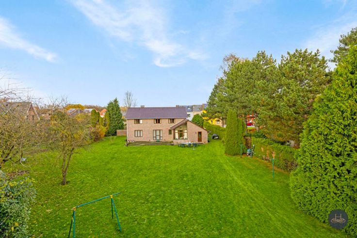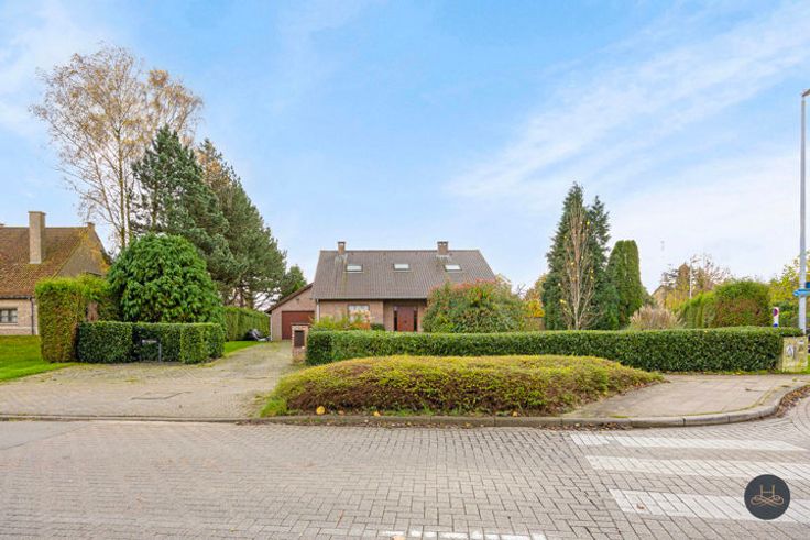 De woning werd vakkundig gebouwd in '90-'91 op 25 are met degelijke materialen, is ook uitbreidbaar. Ingeplant 20 m achter de straat met een voortuin: 24,6m breed aan straat, midden tuin 45m breed en is 75m diep. Achterin is er een ruime brede tuin, ZUID gericht, met zicht op de achtergelegen velden. Een kind-vriendelijke plustuin met “zuidelijke” oase. Het gelijkvloers omvat een ruime inkomhall met aan beide zijden een bureau (of salon/hobby-kamer, resp 27 en 19m2), apart toilet, leefruimte op zuid, de ingerichte keuken, aparte eet/zitplaats, wasplaats en een inpandige garage 1 wagen. Op de verdieping zijn 4 slaapkamers met hoge plafonds, apart toilet, een badkamer met ligbad, dubbele wastafel, douche, ruime inmaakberging. Tenslotte is er onder de woning een droge, stevige kruipkelder. Vooraan straat zijn buiten 2 autoplaatsen.