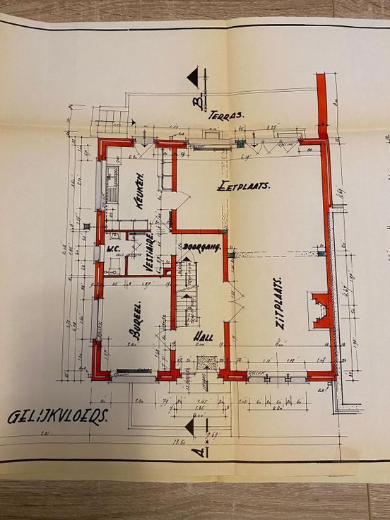 On the ground floor, there is an entrance hall with a separated toilette, leading to spatious L-shaped living area of +/- 45 sqm with a fire place. There is also a dining area, a fully equipped Eggo kitchen and a bright office.