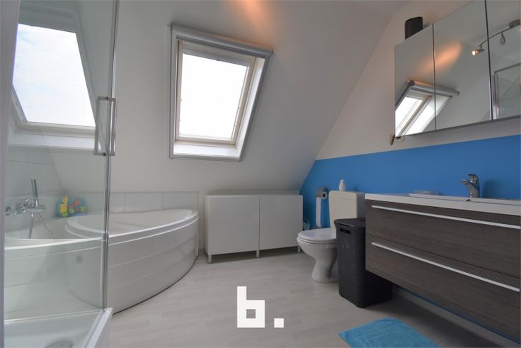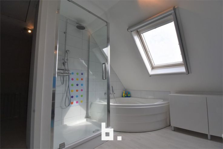 Op de eerste verdieping: 3 slaapkamers, badkamer met douche & apart bad, dubbele lavabo.