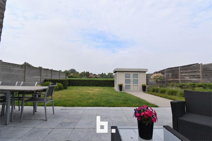 Ruime ingerichte tuin met tuinhuis.