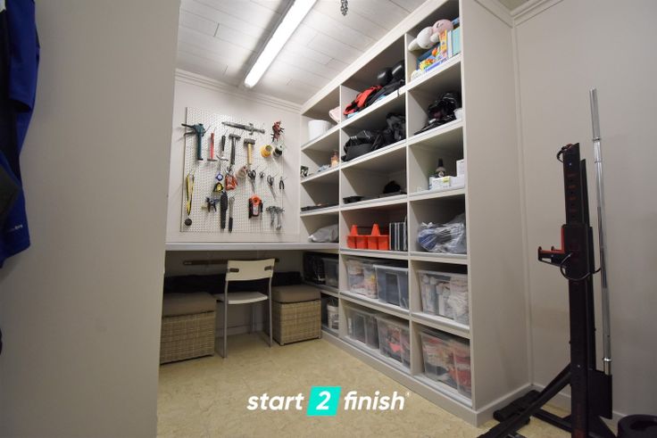 De indeling is als volgt: inkomhal, ruime living (die momenteel opgesplitst is in een speelkamer en een hobbyruimte), volledig uitgeruste leefkeuken, toilet, diverse ruimte bergingen, grote bijkeuken, badkamer met douchebad en lavabo, ruime garage met zolder