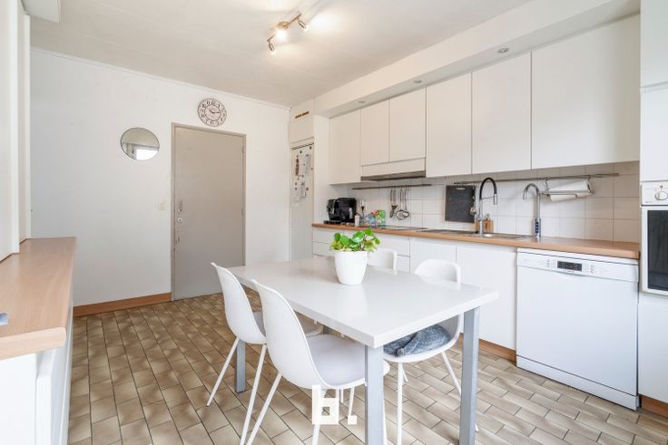 De volledig geïnstalleerde keuken beschikt over alle nodige voorzieningen (vaatwas, frigo, oven...).