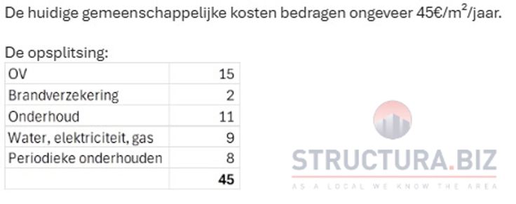 De huidige gemeenschappelijke kosten bedragen ongeveer 45€/m²/jaar.