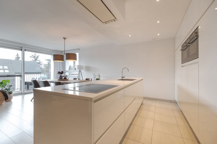 Via trap of lift bereiken we de tweede verdieping, waar zich het aangeboden appartement bevindt. Via de inkomhal bereiken we enerzijds het gastentoilet en anderzijds de ruime leefruimte met volledig geïnstalleerde, open keuken met kookeiland en tal van ingemaakte kasten. De leefruimte beschikt over een overvloed aan lichtinval dankzij de grote raampartijen en een sfeerhaard die zorgt voor extra gezelligheid.
