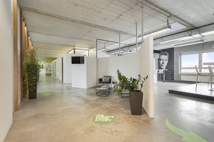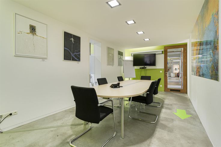 Ontvangstruimte met vergaderzaal,14 bedienden kantoren gescheiden door glazen wanden, bedrijfsrefter met keuken, landschapskantoor met vergaderhoek.