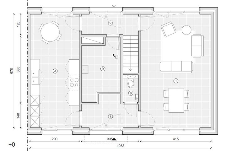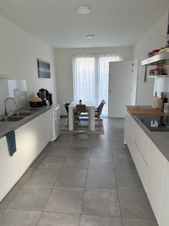 De woning beschikt gelijkvloers over een inkom met vestiaire, een ruime leefruimte, een volledig uitgeruste eetkeuken en een bergruimte. De leefruimte en keuken zijn van het type ‘doorzon’, ze grenzen zowel aan de eigen tuin als aan het gemeenschappelijke erf.
