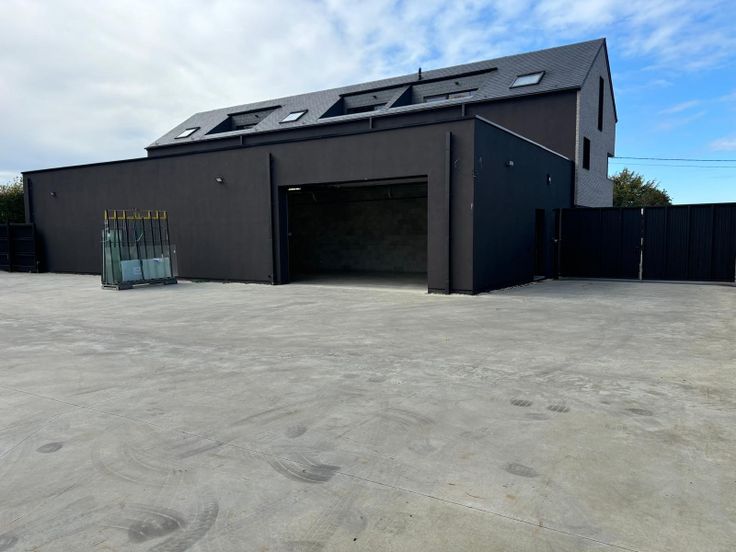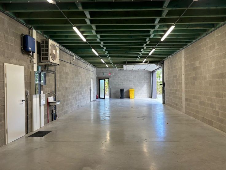 Hall de stockage de 120 mètres carrés (20 mètres sur 6 mètres) isolé comprenant une entrée séparée ainsi qu’une porte sectionnelle motorisée de quatre mètres avec grand espace de parking et de manœuvres non visible de la rue.