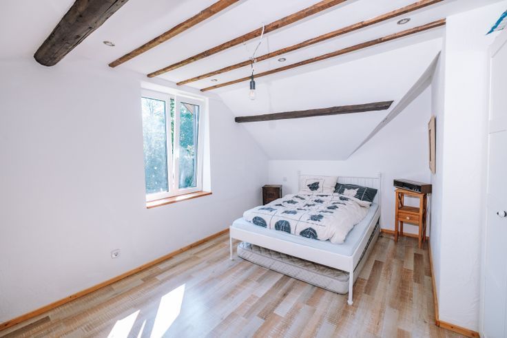 - Au deuxième étage : un vaste espace ouvert de plus de 30m2 aménagé en chambre et en bureau