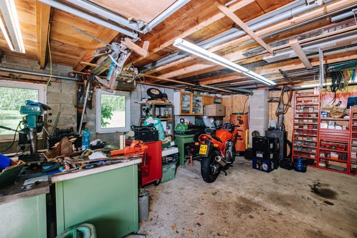 Le garage : Avec deux portes de garage pour les voitures et une grande porte sectionnelle pour les véhicules utilitaires, il est parfaitement équipé. Cet espace pourrait également servir d'espace de travail. Un espace lumineux se trouve au dessus.