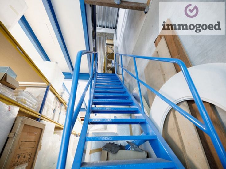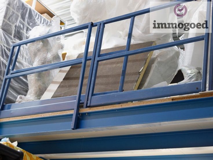 Via de brede metalen trap is er toegang tot het platform van 60 m², rondom met valbeveiliging en een palletpoort.