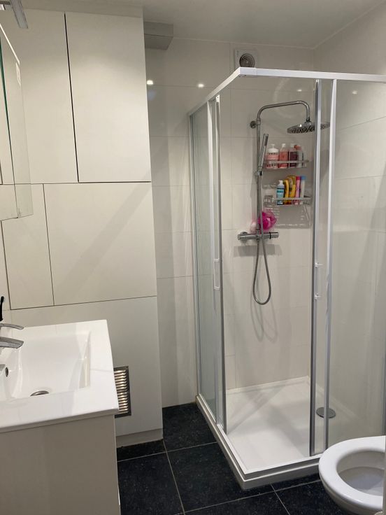 Badkamer met hangtoilet, wastafel en douche, verwarmingsketel Vaillant op gas
