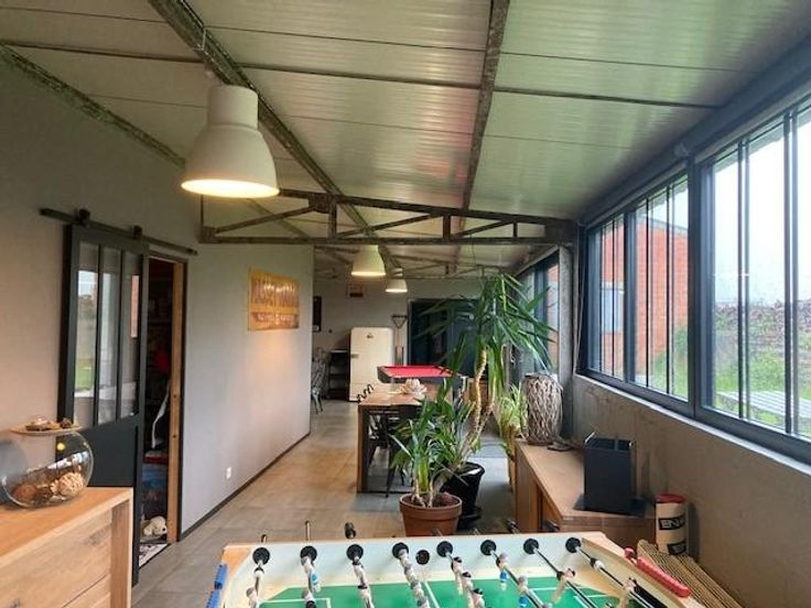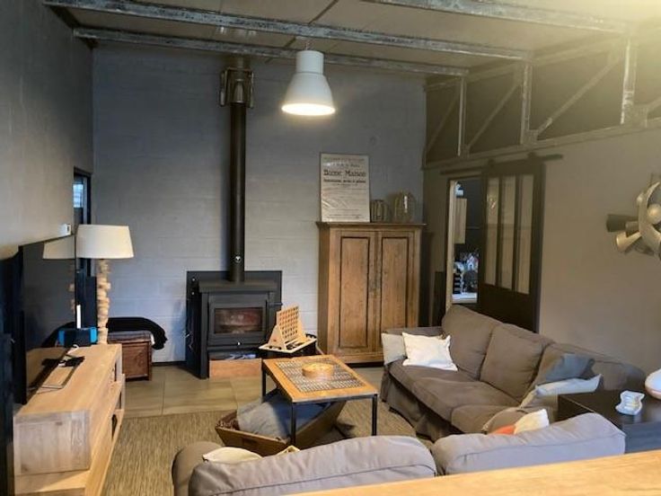 Prendre contact au 071/38.84.49 (OPTION 1) Bel ensemble immobilier repris au cadastre comme « Entrepôt » sis à 6500 Beaumont (Leval-Chaudeville), rue de Leugnies, 4 + rue du Falin 36/1, cadastré Section B, n°0293HP0000, sur une superficie totale de 61ares 19 centiares, comprenant : 1/ Partie aménagée en logement de style « Loft », coté à Rue du Falin, n°36/1, composé de: un grand hall longitudinal, un living, une salle à manger, cuisine (mobilier type professionnel ne faisant pas partie de la vente, sauf à négocier l'achat du mobilier via l'Etude), WC, 3 chambres (une avec un espace bureau), petit bureau, salle de bains, buanderie, cellier, salle de jeux (ou bureau) et un jardin. ATTENTION : absence de permis pour la transformation en logem r achète en connaissance de cause, et s'engage à régulariser la situation si celle-ci est régularisable, à l'entière décharge du vendeur. Châssis PVC, double vitrage. Chauffage : - poêle à bois : ne faisant pas partie de la vente (ou à négocier achat via l'Etude). - gaz-central : desservant salle de bains et cuisine ; citerne PRIMAGAZ +/- 1000L située à l'extérieur (parking), chaudière de 2019. Rapport CONFORME (Gaz), et peut (à nouveau) être mise en service. Remarque : Il existe une imbrication par rapport aux hangars et ateliers contigus, tant au niveau de la disposition des lieux, qu’en matière de compteurs d’eau et électricité ; PEB (loft) : Indice F - 471kWh/m².an 2/ Hangar – garage : 4 entrées indépendantes, via portes coulissantes,