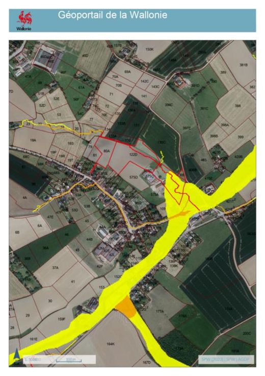 Ville de Tournai (Mourcourt) - septième division Des terres sises au lieu-dit « village » cadastrées ou l'ayant été d'après titre section C, numéros 80A, 122, 123B, et 0130B pour une contenance totale de trois hectares quarante-neuf ares quatorze centiares (34.914 m²), et d'après extrait cadastral récent section C, numéros 0080A, 0122A, 0122C, 0122D, 0123B et 0130B pour une contenance totale trois hectares quarante-neuf ares quatorze centiares (34.914 m²) dont trente centiares (30ca) en surface bâtie et trois hectare quarante-huit ares quatre-vingt quatre centiares (3ha 48a 84ca) en zone agricole (sauf le front-à-rue du bien cadastré n°80A qui lui est en zone d’habitat caractère rural sur 50m à front de voirie depuis la rue du Vieux Comté). pées par bail à ferme;