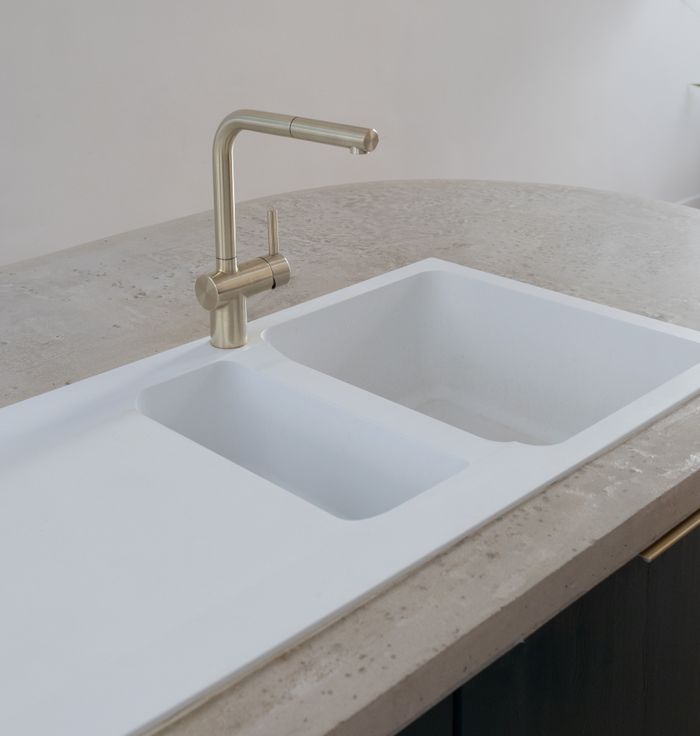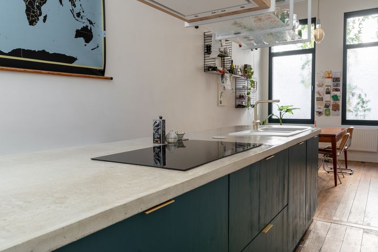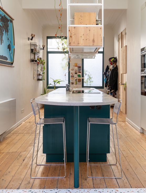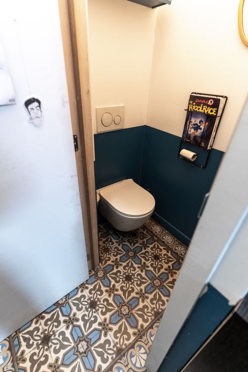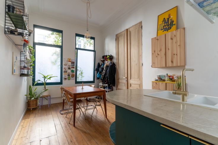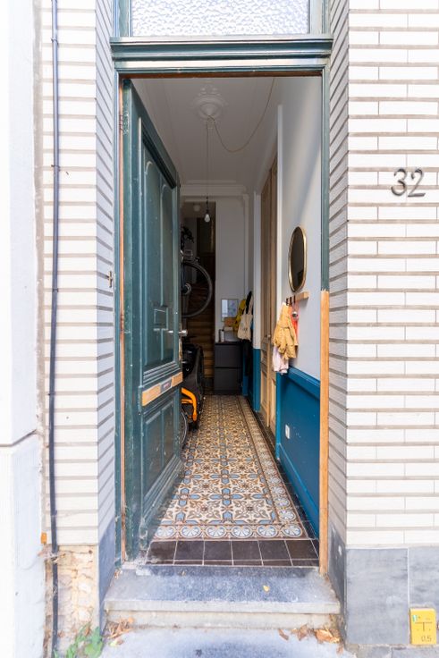 Prachtige burgerwoning, volledig gerenoveerd in 2020, voorzien van alle ecologische en moderne luxe. Bij het binnenkomen zie je meteen de charmante originele tegelvloer in de hal met mooie sierlijsten en handig gastentoilet. Aan de straatkant bevindt zich de eetkamer waar je dankzij de ramen met figuurglas geniet van alle privacy. De keuken werd volledig op maat gemaakt door een vakkundige schrijnwerker. De basis bestaat uit Rubberwood en werd afgewerkt in donkergroen lariks hout. Het afgeronde betonnen werkblad en gouden details maken het helemaal af. De vide met groot raam zorgt voor veel lichtinval en contact met de bureauruimte.