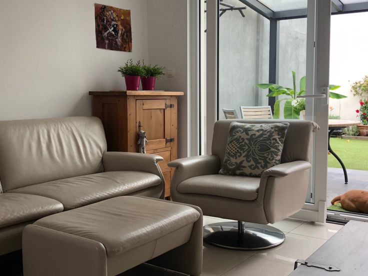 In de woonkamer bevindt zich een volledig uitgeruste keuken met nieuwe combinatie-oven, afwasmachine, inductiekookplaat en dampkap. Een koelkast/diepvries combinatie maakt de keuken compleet. Het keukeneiland heeft een gootsteen en geïntegreerde eettafel met hoge stoelen.