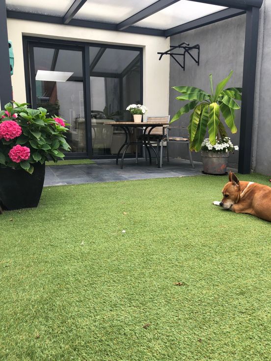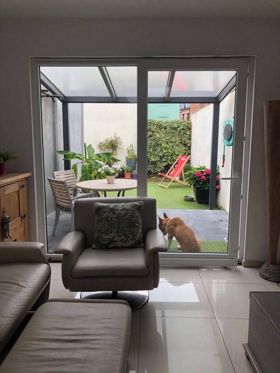 Achteraan de benedenverdieping is er toegang tot een koer/tuin van 25 m² in een L-vorm. Voldoende groot voor berging, BBQ of een tuinset te plaatsen.