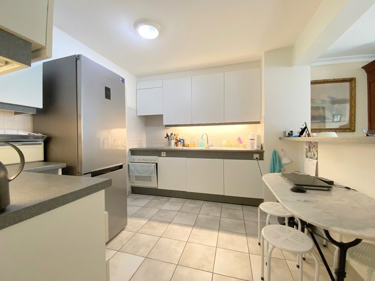 In het centrum van Knokke: ruim appartement met inkom, vestiaire, toilet, grote living met volledig ingerichte keuken, ruime berging, 2 slaapkamers, douchekamer, badkamer en terras. Eveneens gemeenschappelijke fietsenberging op het gelijkvloers. Gemeenschappelijke kosten bedragen € 80 per maand.