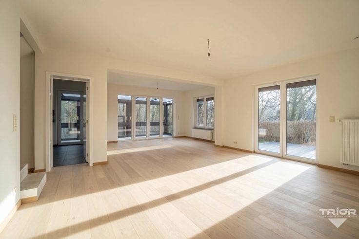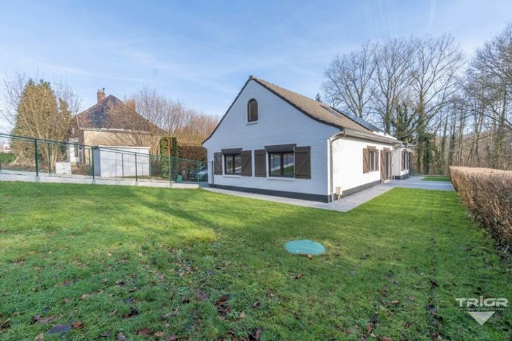 TRIOR Waterloo vous propose cette charmante villa habitable de plain pied et ENTIEREMENT rénovée avec des matériaux de qualité. Implantée sur un joli terrain privatif (16a59ca) avec partie boisée, elle développe 189m² NET habitables (275m² brut) et se compose au rez-de-chaussée comme suit: hall d'entrée avec vestiaire et toilette visiteurs, lumineux séjour de 37,80m² donnant sur la terrasse et la véranda (18,30m²), cuisine super-équipée, 3 chambres (13,80m², 10,10m²; 9,00m²) et une salle de douche (meuble avec lavabo et douche à l’italienne). Le 1er étage comprend 2 chambres supplémentaires (12,00m²; 9,20m²), une salle de bain (meuble avec lavabo, baignoire et toilette suspendue) et du rangement sous les combles. DIVERS: construction traditionnelle, système de ventilation à double flux, panneaux photovoltaïques, installation électrique conforme, châssis en PVC double vitrage partout (volets électriques), chauffage central au gaz (condensation), vidéophone, terrasse orientée Sud-Ouest, garage (3,00 x 6,72), plusieurs emplacements de parking à l’extérieur, caves, citerne d’eau de pluie avec groupe hydrophore, tout à l'égout, etc. PEB classé A. On y dépose ses valises! Descriptif complet sur www.TRIOR.be