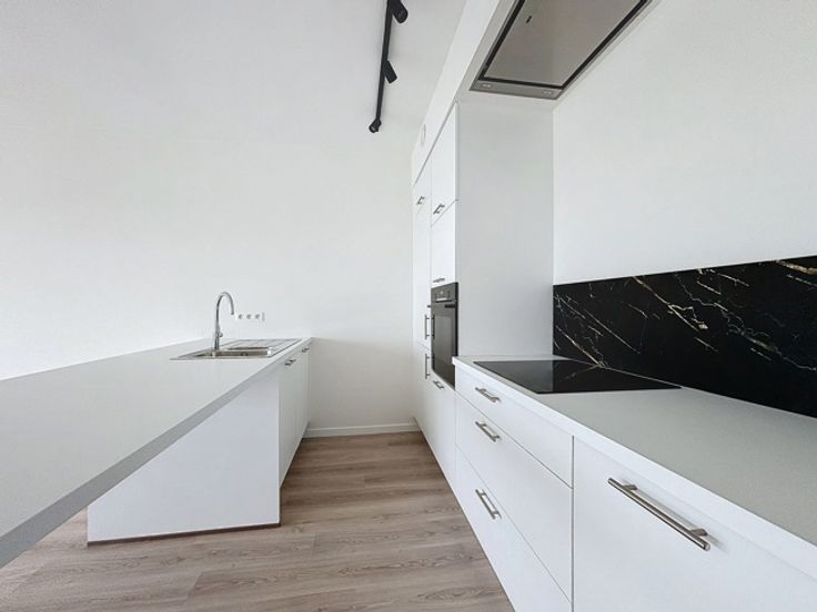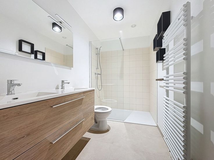 Une salle de douche élégante avec meuble double vasque et WC, un WC séparé dans l’entrée ainsi qu’une buanderie pratique et bien aménagée complètent l’appartement.