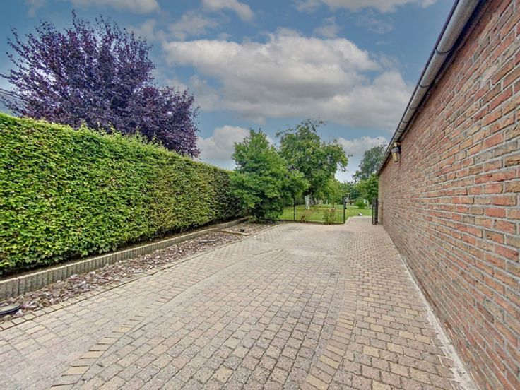 # Buiten: mooi terras, tuin op het zuiden met bomen en omheining, 2 zijgangen, garage met gemotoriseerde sectionale deur en 2 parkeerplaatsen aan de zijkant van het huis, schuur van 25 m² (met elektriciteit en water) en nog een kleine schuur naast het huis.