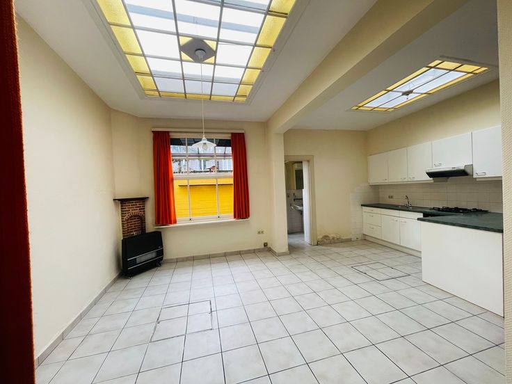 Inkomhal, gezellige dubbele living , grote zit en kookkeuken 35 m2, badkamer, toilet , overdekte koer, kelder.