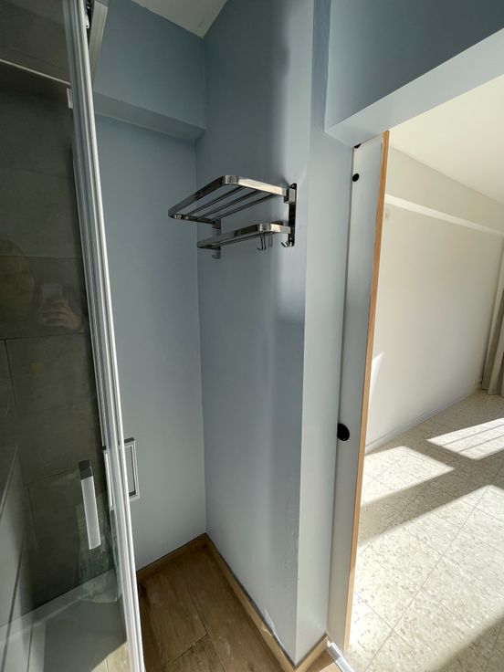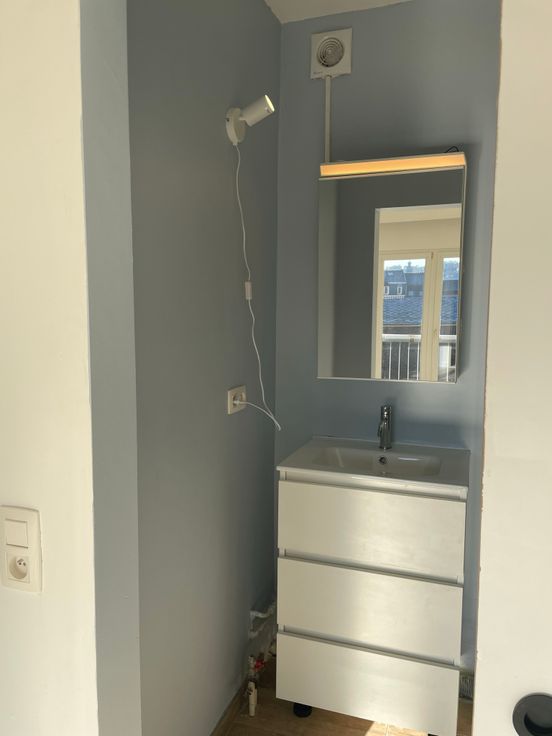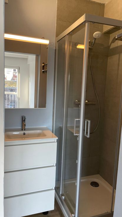 •Sanitaires : Douche, lavabo avec meuble de rangements, miroir avec rangement intégré, porte serviette, extracteur d’humidité.