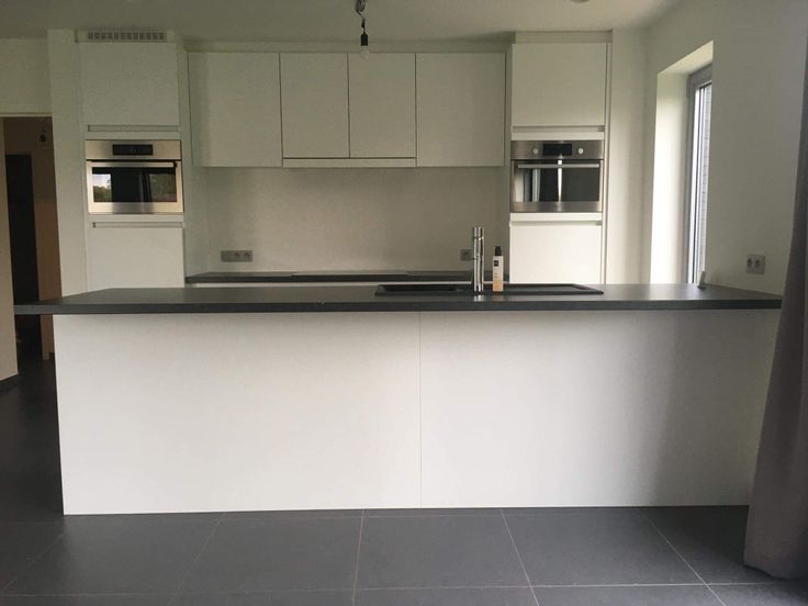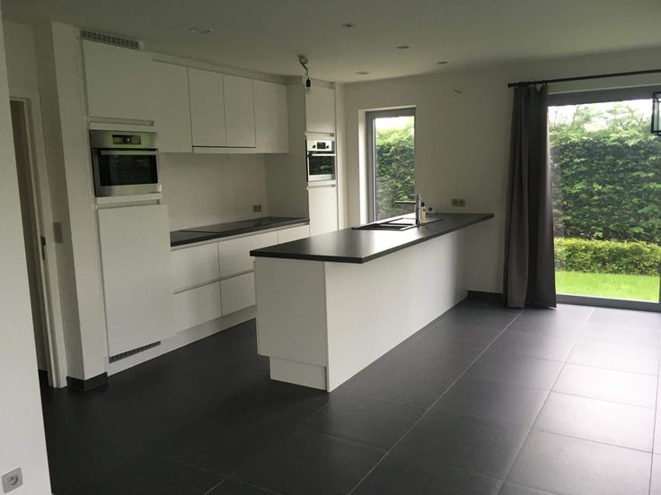 Open keuken met eiland voorzien van alle moderne apparatuur (koelkast, oven, combi-oven, grote inductie kookplaat).