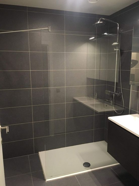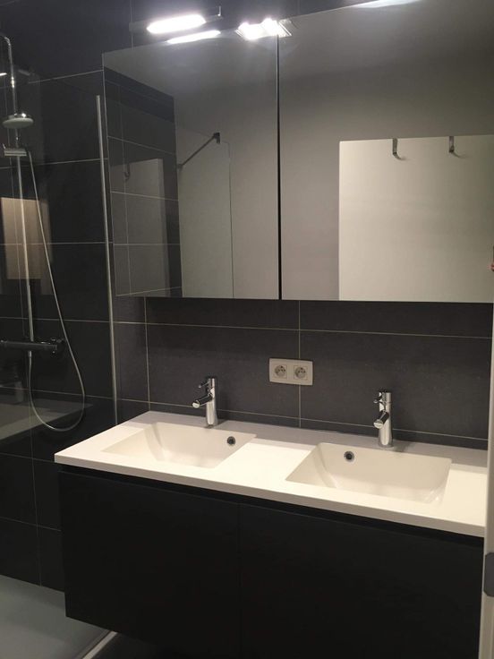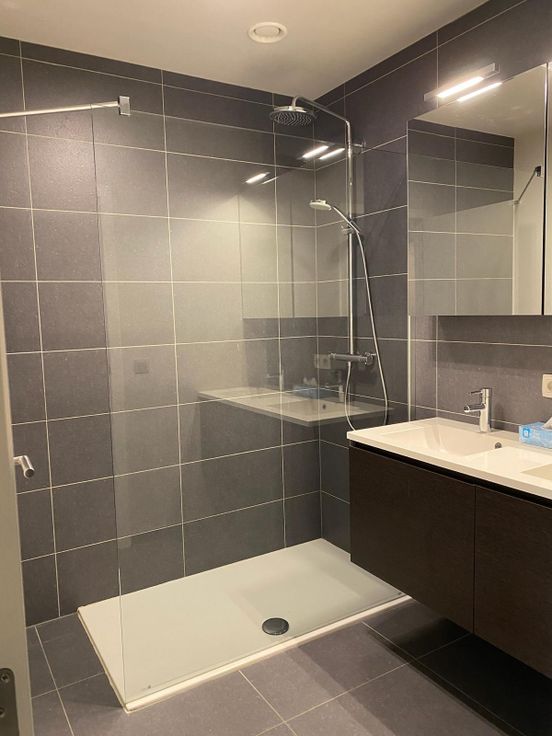 Badkamer (5m2) met inloopdouche, wandverwarming, dubbele lavabo en spiegelkast.