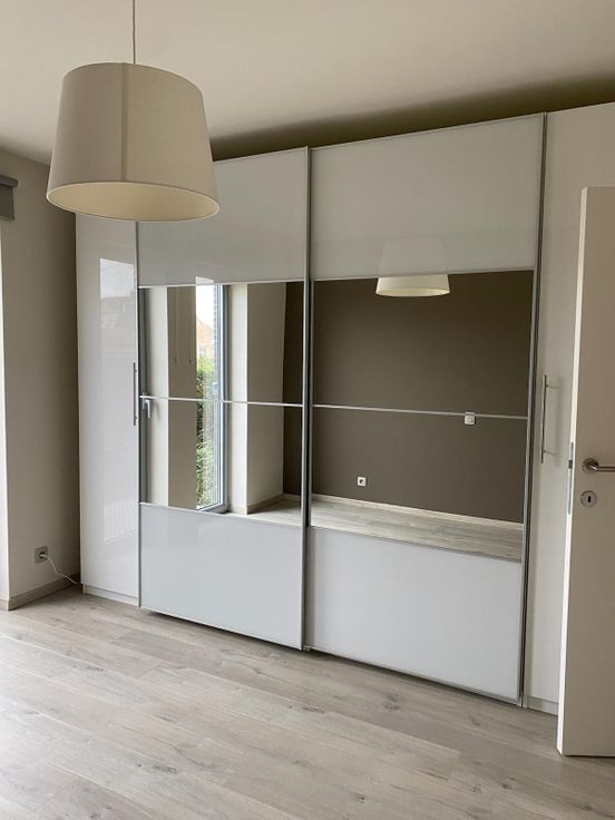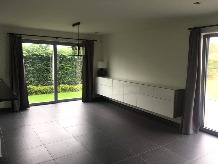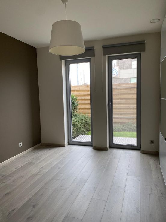 Een lichtrijke leefruimte (28,5m2) met schuifraam, vloerverwarming, inbouwkast en toegang tot tuin en terras.