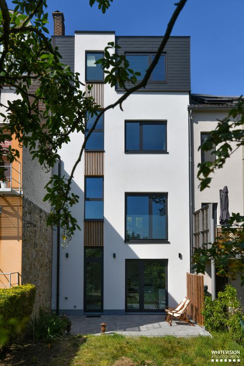 La maison a été rénovée de fond en comble et avec goût en 2020. Elle comprend, au rez-de-chaussée, un hall d'entrée avec wc et un living/salon. Au rez-de-jardin, une belle cuisine équipée s'ouvrant sur la terrasse et le petit jardin, une buanderie et une grande cave. Au premier étage, deux chambres et une salle-de-douche avec wc. Au deuxième étage, un grenier.