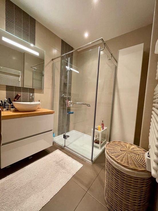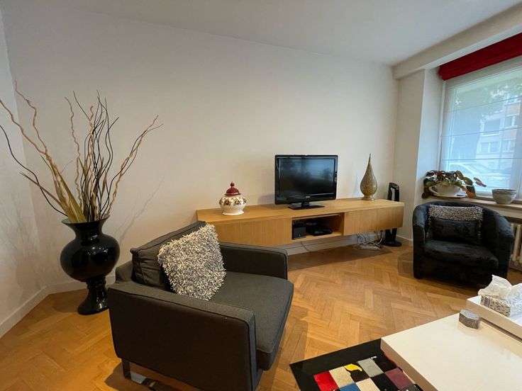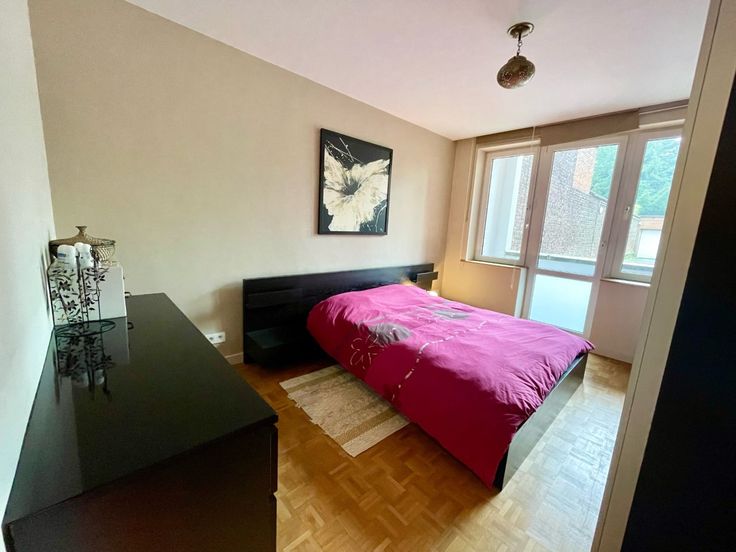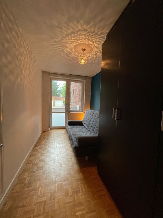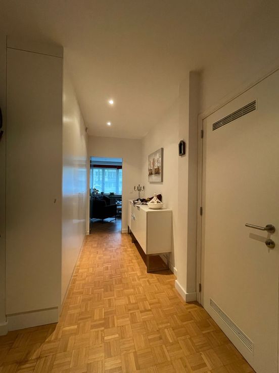 Appartement lumineux et moderne de 95m² situé au rez-de-chaussée d’un immeuble bien entretenu, à proximité de plusieurs parcs, transports et commerces. Il se compose d’un hall d’entrée avec rangement et buanderie, espace de vie lumineux ouvert sur cuisine super équipée; hall de nuit donnant sur deux chambres de 15 et 9m² avec accès à une terrasse arrière orientée sud, salle de douche italienne, toilettes séparée. Cave en sous-sol. Libre immédiatement. Provisions de charges : 150/mois comprenant les communs, eau chaude et chauffage.